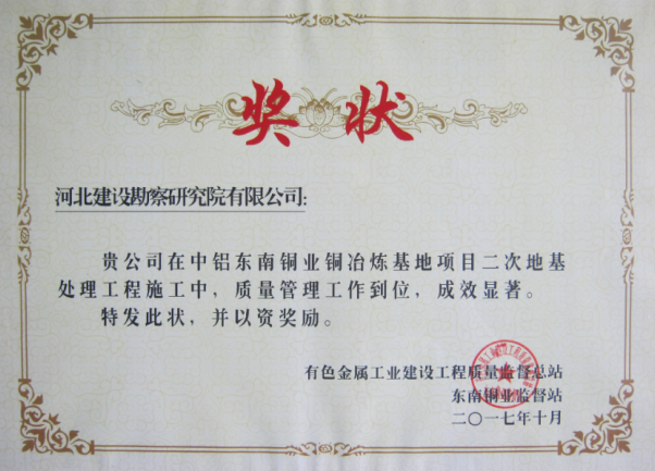 公司承接的福建省寧德市中鋁東南銅業(yè)銅冶煉基地項目二次地基處理工程,施工中嚴(yán)格執(zhí)行公司規(guī)章制度及綜合管理體系標(biāo)準(zhǔn),精心策劃,嚴(yán)格控制,科學(xué)管理。在現(xiàn)場10多家施工單位各項檢查評比中,得到了業(yè)主中鋁東南銅業(yè)有限公司的表揚(yáng),對現(xiàn)場安全、質(zhì)量、進(jìn)度管理給予了高度評價,分別授予“項目管理突出”獎和“質(zhì)量管理”獎。