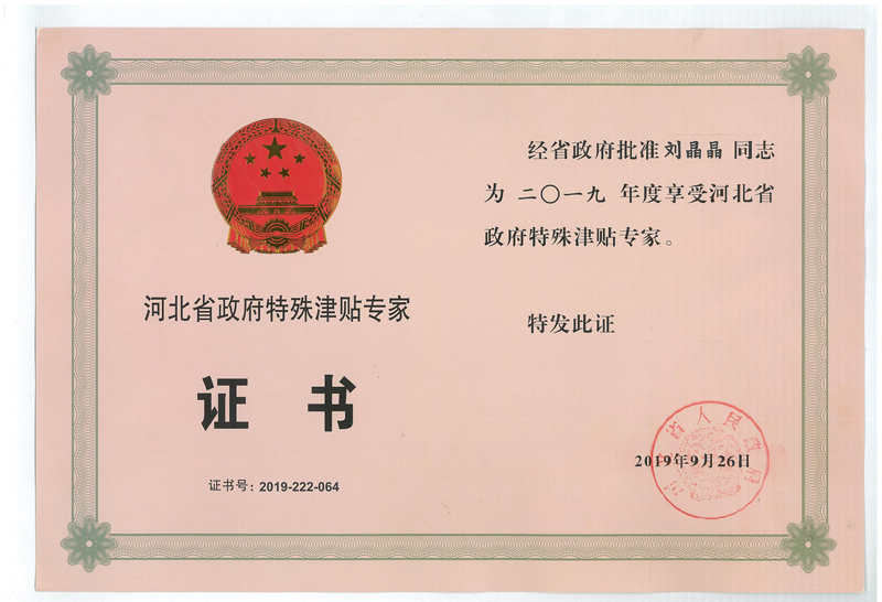 經(jīng)公司組織申報,石家莊市人民政府推薦,省人力資源和社會保障廳評審,省政府同意,公司劉晶晶同志榮獲省政府特殊津貼專家稱號。