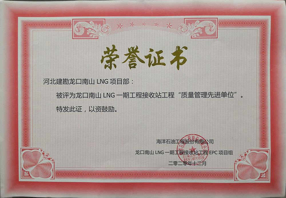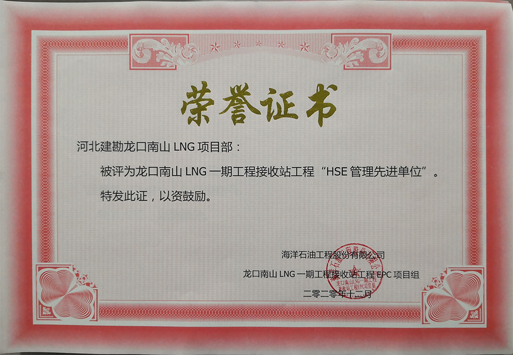 2020年12月,公司收到海洋石油工程股份有限公司發(fā)來的表揚(yáng)信,對我公司在龍口南山LNG一期工程接收站工程EPC項(xiàng)目儲罐樁基工程標(biāo)段一施工過程中,面對施工現(xiàn)場地質(zhì)情況復(fù)雜、新工藝、施工難度大、氣候炎熱多雨、新冠疫情、人材機(jī)緊缺等不利因素,按合同要求順利完成了一標(biāo)段1#和2#儲罐3497根振沖碎石樁和720根樁柱一體化灌注樁全部施工任務(wù),給予了高度認(rèn)可和好評,并表示感謝!我公司被評為“質(zhì)量管理先進(jìn)單位”和“HSE管理先進(jìn)單位”并頒發(fā)了榮譽(yù)證書,同時(shí)對先進(jìn)個(gè)人頒發(fā)了“優(yōu)秀項(xiàng)目管理者”、 “HSE管理先進(jìn)個(gè)人”、 “質(zhì)量管理先進(jìn)個(gè)人”榮譽(yù)證書。