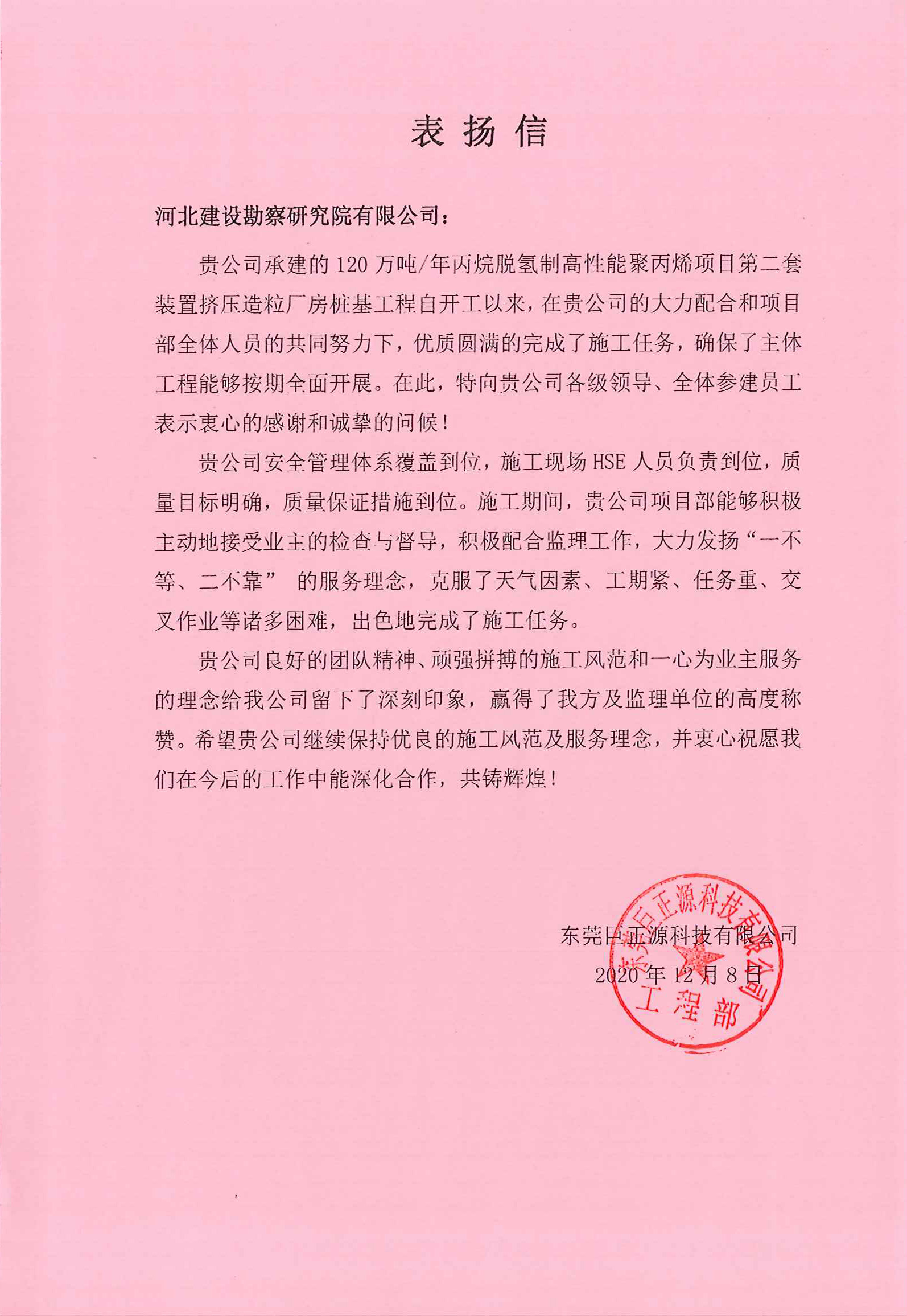 東莞巨正源120萬噸/年丙烷脫氫制高性能聚丙烯項(xiàng)目第二套裝置擠壓造粒廠房樁基工程自開工以來,安全管理體系覆蓋和質(zhì)量保證措施到位,大力發(fā)揚(yáng)“一不等、二不靠”的服務(wù)理念,克服了工期緊、任務(wù)重、交叉作業(yè)等諸多困難,出色地完成了施工任務(wù)。特向公司各級(jí)領(lǐng)導(dǎo)、全體參建員工表示衷心的感謝和誠(chéng)摯的問候!