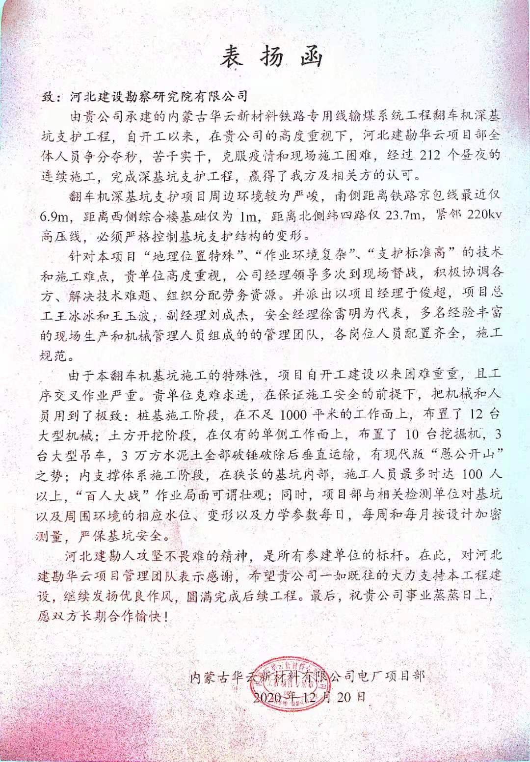 在表揚(yáng)信中,對于我們河北建勘人攻堅(jiān)不畏難的精神予以了充分肯定和高度評價,被認(rèn)為是所有參建單位的標(biāo)桿,并希望我公司繼續(xù)發(fā)揚(yáng)優(yōu)良作風(fēng),圓滿完成后續(xù)工程,愿雙方長期合作。
