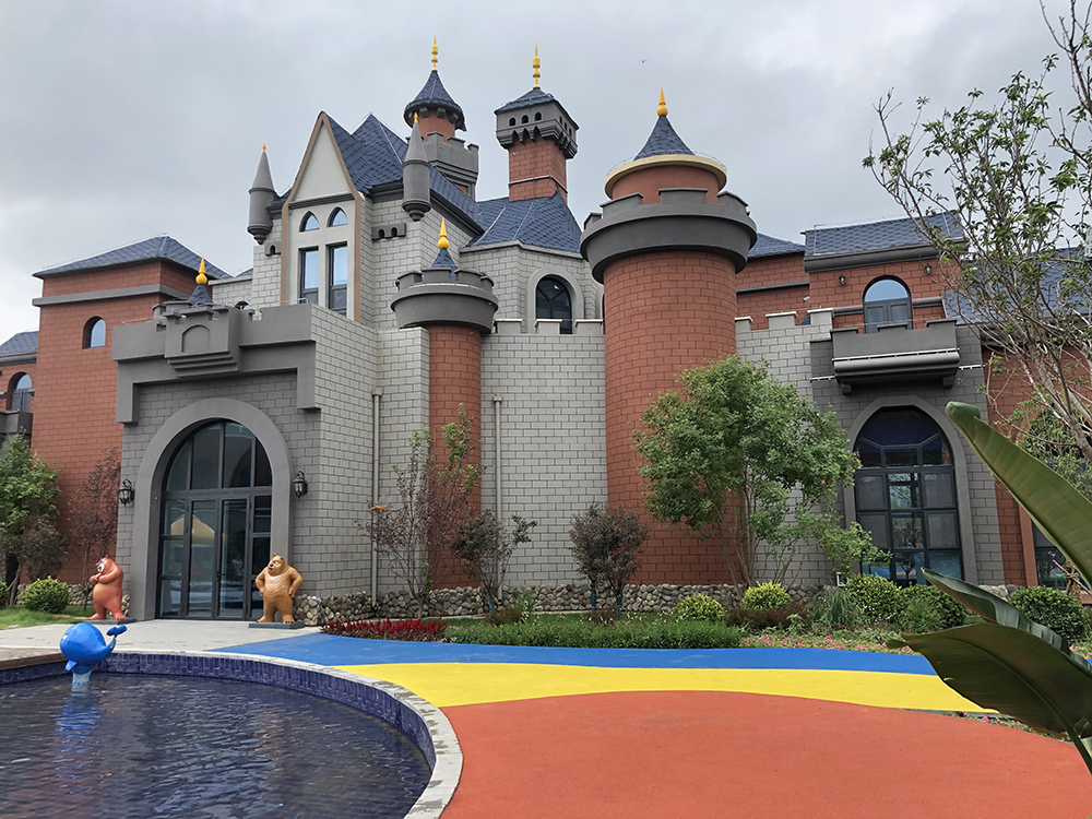 兒童館采用框架結(jié)構(gòu),地上二層,層高5.2m,建筑面積825.32㎡,建筑總高度12.55m(地面至屋脊高點(diǎn))。一層設(shè)置為展覽、兒童休閑空間,局部二層為兒童游樂(lè)空間、兒童閱讀空間及小型演藝舞臺(tái),二層設(shè)置有有露天城墻參觀(guān)廊,可以俯視園內(nèi)景色。外立面設(shè)計(jì)為中世紀(jì)歐洲古城堡風(fēng)格,打造濱水古堡景觀(guān),建筑高度錯(cuò)落,材質(zhì)肌理豐富,屋頂色彩鮮艷。使游客仿佛穿越到中世紀(jì)童話(huà)世界。