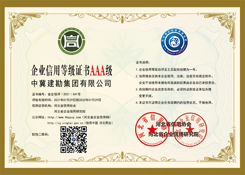 根據(jù)河北省信用辦、河北省信用協(xié)會等七部門印發(fā)的《關(guān)于開展“推進誠信建設(shè)共建信用河北”的活動方案》的通知,河北省信用協(xié)會、河北省企業(yè)信用研究院對“守合同重信用”企業(yè)進行認定,我公司繼續(xù)被評定為“河北省AAA級守合同重信用企業(yè)”。