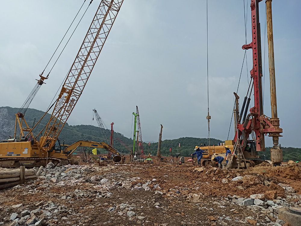 本工程于2021年04月10日開工,2022年01月27日現(xiàn)場(chǎng)樁基施工完工,工程施工期間累計(jì)投入施工人員200余人和大功率旋挖鉆機(jī)10臺(tái)以及相關(guān)匹配的機(jī)械設(shè)備??朔擞昙?、高溫和地質(zhì)條件復(fù)雜等諸多不利因素,累計(jì)完成鉆孔灌注樁1857根,處理溶洞約31000m³(含回填片石、水泥、C20砼及注漿和遇溶洞樁超灌混土量)。