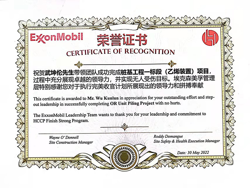 5月30日,??松梨冢ɑ葜荩┗び邢薰菊匍_2022年工作表彰大會,我公司參建的惠州美孚乙烯一期樁基工程項目部,在參建的30余家施工單位中以優(yōu)異的成績,榮獲“優(yōu)秀管理團隊”稱號,生產(chǎn)設(shè)備科科長兼項目經(jīng)理武坤倫榮獲 “卓越領(lǐng)導(dǎo)力”個人榮譽證書,項目部每位員工都收到了業(yè)主頒發(fā)的獎品。