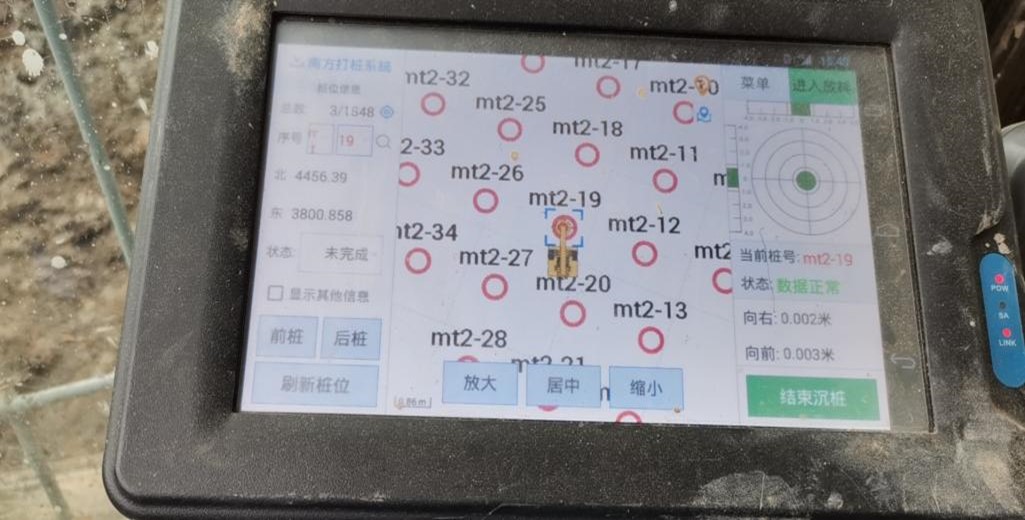 本工程自2021年2月21日開(kāi)工,2022年3月21日完工,總歷時(shí)375天。2021年5月進(jìn)入施工高峰期,使用旋挖鉆機(jī)9臺(tái),每日完成樁數(shù)約 70根。由于測(cè)放樁位的工作量大,采用全站儀測(cè)放效率較低,影響施工進(jìn)度,經(jīng)研究引進(jìn)了智能打樁系統(tǒng)。在引進(jìn)智能打樁系統(tǒng)后,先與全站儀測(cè)放的樁位進(jìn)行對(duì)比測(cè)試,對(duì)其測(cè)放樁位的精度和效率進(jìn)行了驗(yàn)證,滿(mǎn)足精度要求,并在項(xiàng)目實(shí)施過(guò)程中及時(shí)總結(jié)使用經(jīng)驗(yàn),為進(jìn)一步推廣智能化打樁系統(tǒng)的應(yīng)用打好基礎(chǔ)。本工程在鋼筋籠制作方面,采用了3臺(tái)滾籠機(jī)進(jìn)行箍筋纏繞工作,提高了工作效率并減少了人員投入,保證了施工進(jìn)度需要。