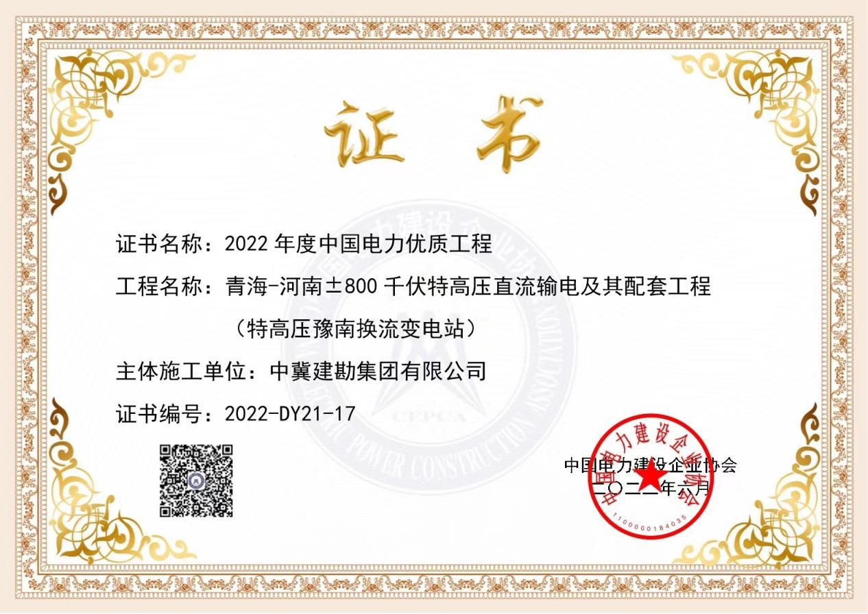 近日,中國電力建設企業(yè)協(xié)會公布了2022年度中國電力優(yōu)質工程評審結果,我公司作為青海-河南±800千伏特高壓直流輸電及配套工程(特高壓豫南換流變電站)樁基施工單位,榮獲2022年度中國電力行業(yè)優(yōu)質工程獎。“中國電力優(yōu)質工程獎”是我國電力建設行業(yè)工程質量的最高榮譽,公司獲此殊榮,充分彰顯了我公司在行業(yè)內雄厚的綜合實力,樹立中冀建勘在電力行業(yè)的良好企業(yè)形象。