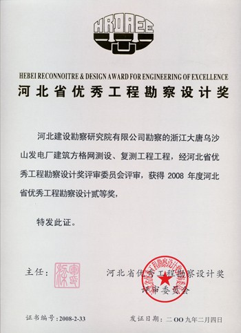 我公司承擔(dān)的浙江大唐烏沙山電廠建筑方格網(wǎng)測設(shè)、復(fù)測工程獲河北省優(yōu)秀工程勘察設(shè)計(jì)二等獎(jiǎng)。