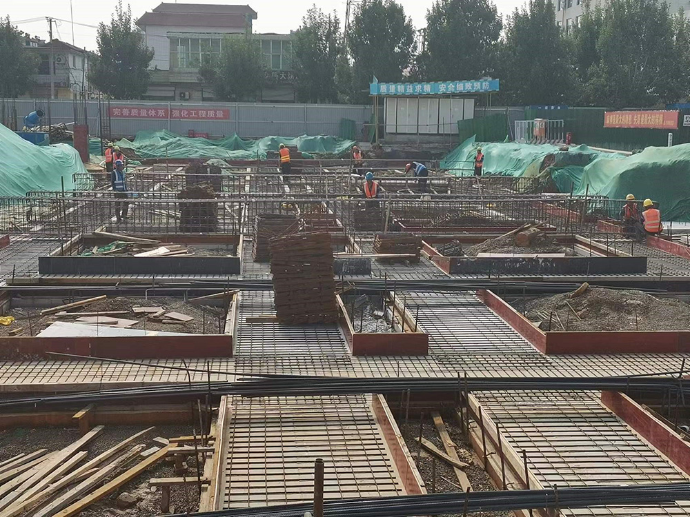 本工程特點如下:①施工場地小,施工材料堆放集中,二次搬運多;②施工過程中勞動力集中,各專業(yè)穿插作業(yè)多,其中基礎(chǔ)施工時需3天內(nèi)組織接近200人同時施工,在新冠疫情影響下組織如此規(guī)模人員短時間進(jìn)場難度較大;③技術(shù)重點多,項目部經(jīng)過科學(xué)嚴(yán)密的組織和監(jiān)管成功的把控了各個施工環(huán)節(jié)質(zhì)量,保證工程達(dá)到驗收標(biāo)準(zhǔn)。