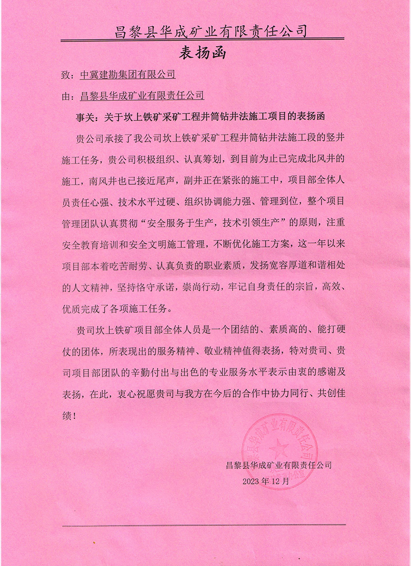 昌黎縣華成礦業(yè)有限責任公司發(fā)來的表揚函,對我公司在坎上鐵礦采礦工程井筒鉆進法施工項目施工過程中,積極組織,認真籌劃,以及項目部全體人員責任心強、技術水平過硬、組織協(xié)調能力強、管理到位,認真貫徹“安全服務于生產,技術引領生產”的原則,不斷優(yōu)化施工方案,已順利完成北風井的施工,南風井也即將完成,表示由衷的感謝和表揚,希望今后合作中協(xié)力同行、共創(chuàng)佳績。