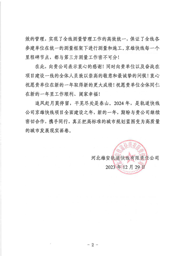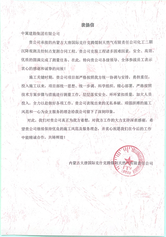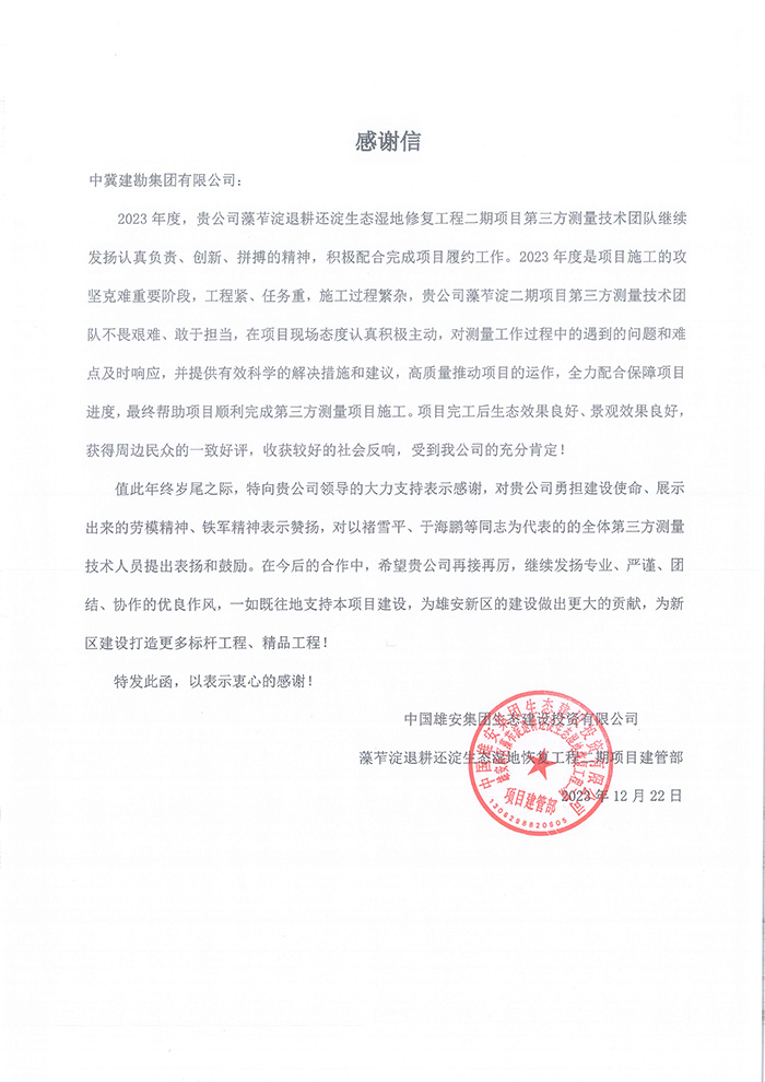 近期,公司陸續(xù)收到中國雄安集團城市發(fā)展投資有限公司、河北雄安軌道快線有限責任公司、中國雄安集團生態(tài)建設(shè)投資有限公司、中鐵五局、中鐵十七局、鄭州地鐵集團、內(nèi)蒙古大唐國際克什克騰旗煤制天然氣電廠、大唐內(nèi)蒙古多倫電廠等業(yè)主單位發(fā)來的感謝信。我公司認真負責、敢打能打硬仗的工作態(tài)度、頑強拼搏的施工風范和一心為業(yè)主服務(wù)的理念,贏得了業(yè)主的高度認可和贊揚,特發(fā)來感謝信深表感謝!