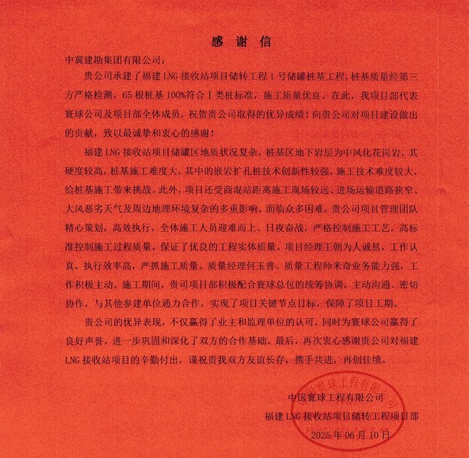 2025年6月12日,我公司收到中國寰球福建LNG接收站項(xiàng)目儲(chǔ)轉(zhuǎn)工程項(xiàng)目發(fā)來的感謝信。信中高度贊揚(yáng)了我公司在項(xiàng)目執(zhí)行過程中展現(xiàn)出的項(xiàng)目高效的團(tuán)隊(duì)管理、精心策劃、高效執(zhí)行。