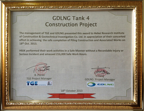 廣東大鵬LNG工程自2013年4月18日開工,至2013年9月4日完成樁基施工,10月份完成包括鑿樁頭在內(nèi)的所有現(xiàn)場施工任務(wù)。在此期間,項目部全體成員一直堅持安全第一的理念,嚴(yán)格按照總包、業(yè)主的安全文明施工要求穩(wěn)步推進工作,得到了總包、監(jiān)理、業(yè)主的一致好評,工程結(jié)束后總包TGE為我公司頒發(fā)了安全文明施工獎狀。
