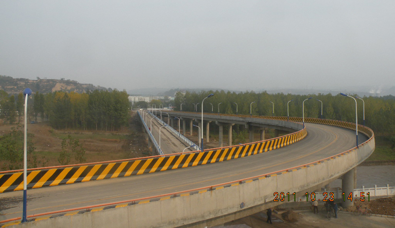 國電霍州發(fā)電廠跨汾河公路大橋東接國道108線(霍侯一級公路),西連電廠運(yùn)煤公路,東接口處南有霍州礦務(wù)局木材加工廠,北有個(gè)體汽車修理廠,居民較少。向西跨越汾河進(jìn)入電廠廠區(qū)后要上跨電廠主要出入道路。橋梁分左、右幅:左幅主要承擔(dān)電廠職工的生產(chǎn)、生活用車通行;右幅主要承擔(dān)電廠運(yùn)煤、運(yùn)渣等車輛通行。終點(diǎn)要與國道108線(霍侯一級公路)相連接,接點(diǎn)位置位于國道108線K826+160處。