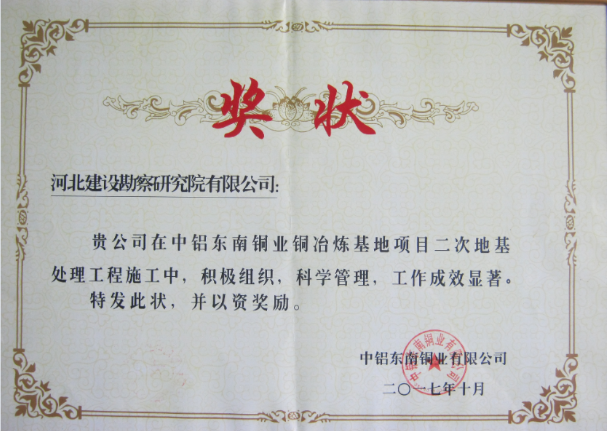 公司承接的福建省寧德市中鋁東南銅業(yè)銅冶煉基地項目二次地基處理工程,施工中嚴(yán)格執(zhí)行公司規(guī)章制度及綜合管理體系標(biāo)準(zhǔn),精心策劃,嚴(yán)格控制,科學(xué)管理。在現(xiàn)場10多家施工單位各項檢查評比中,得到了業(yè)主中鋁東南銅業(yè)有限公司的表揚(yáng),對現(xiàn)場安全、質(zhì)量、進(jìn)度管理給予了高度評價,分別授予“項目管理突出”獎和“質(zhì)量管理”獎。