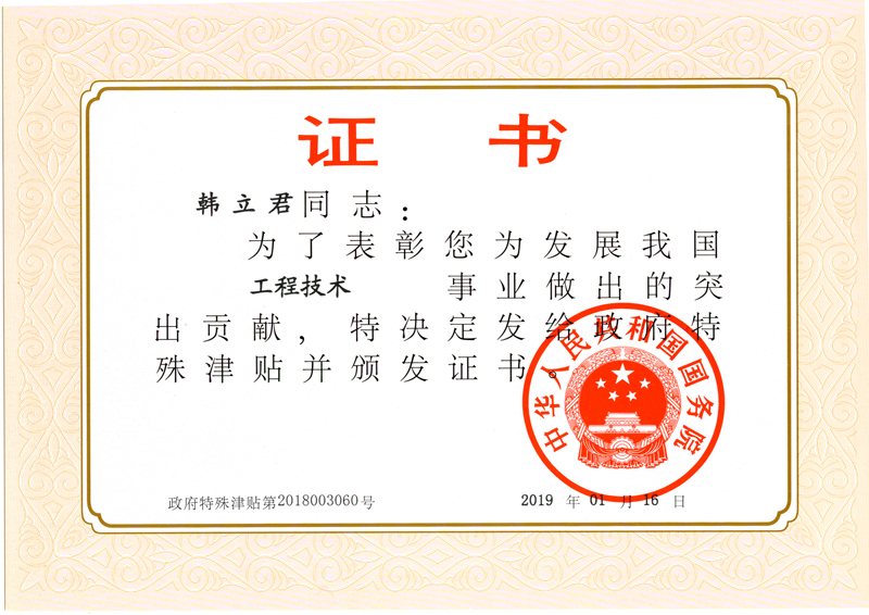 經(jīng)石家莊市人力資源和社會保障局選拔,河北省人力資源和社會保障廳推薦,人力資源和社會保障部組織評審,中華人民共和國國務(wù)院批準(zhǔn),公司董事長韓立君入選國務(wù)院政府特殊津貼專家。