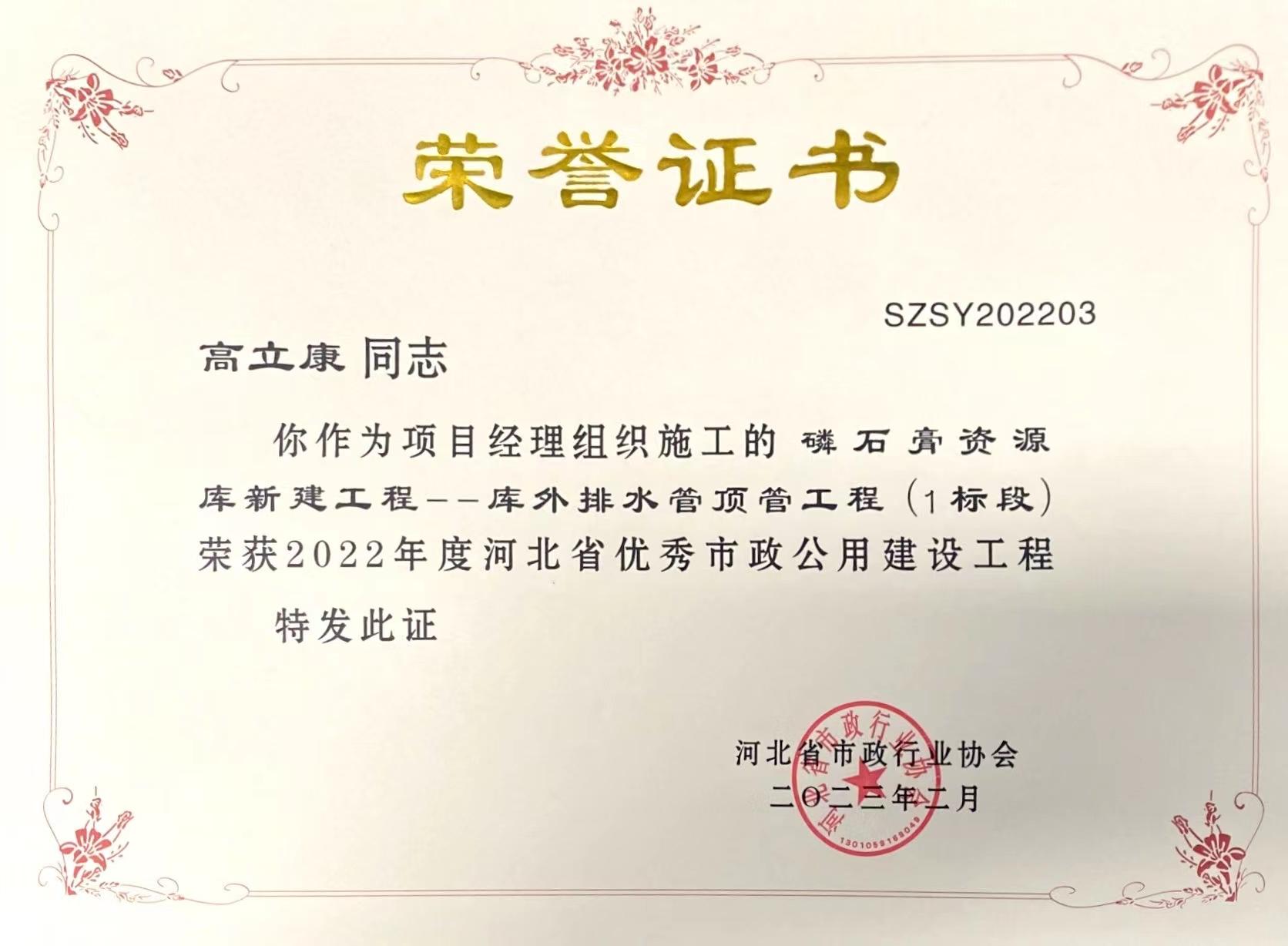 近日,河北省市政行業(yè)協(xié)會(huì)發(fā)布消息,經(jīng)過(guò)審核申報(bào)材料、查驗(yàn)施工現(xiàn)場(chǎng)、專(zhuān)家綜合評(píng)議,我公司市政工程項(xiàng)目“磷石膏資源庫(kù)新建工程——庫(kù)外水管頂管工程(1標(biāo)段)”被評(píng)為河北省優(yōu)秀市政公用建設(shè)工程,并為項(xiàng)目經(jīng)理高立康同志頒發(fā)了榮譽(yù)證書(shū)。