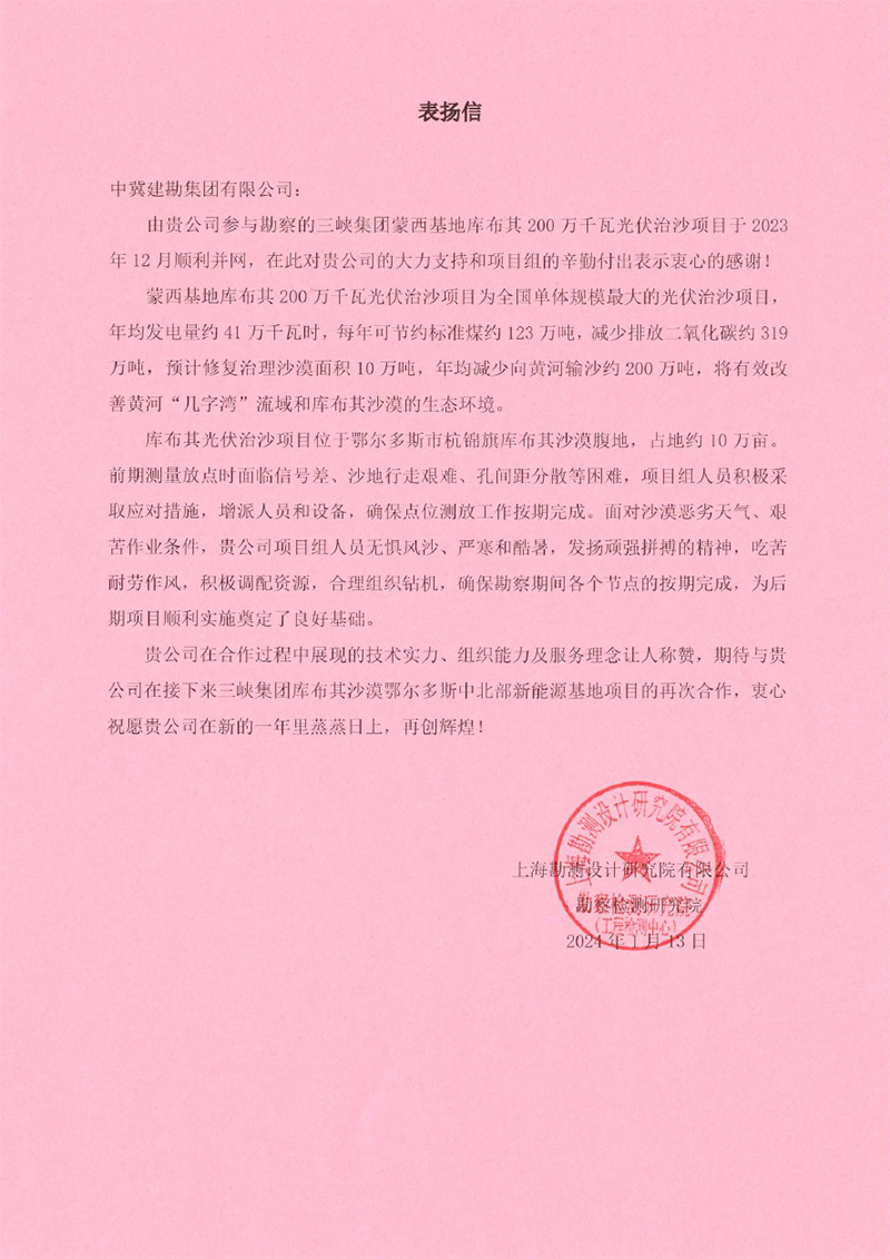 中能建建筑集團有限公司發(fā)來的表揚信,對在烏茲別克斯坦布哈拉州500MW光伏項目建設過程中,項目部全體人員發(fā)揚“一不等,二不靠”的服務理念,克服工作環(huán)境和地質復雜等困難,在公司的大力支持和項目全體人員的共同努力下,圓滿完成了項目要求的節(jié)點目標,特向我公司表示衷心的感謝和誠摯的問候,愿今后繼續(xù)精誠合作,共鑄輝煌。