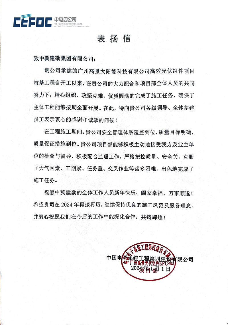 中國電子系統(tǒng)工程第四建設有限公司發(fā)來的表揚信,對我公司在廣州高景太陽能科技有限公司高效光伏組件項目建設過程中,公司的大力配合和項目部全體人員的共同努力下,安全管理體系覆蓋到位,質量保證措施到位,嚴格把控質量、安全關,出色完成了施工任務,特向我公司各級領導、全體參建員工表示衷心的感謝,并授予“優(yōu)秀安全管理團隊”和“優(yōu)秀資料包商”榮譽。