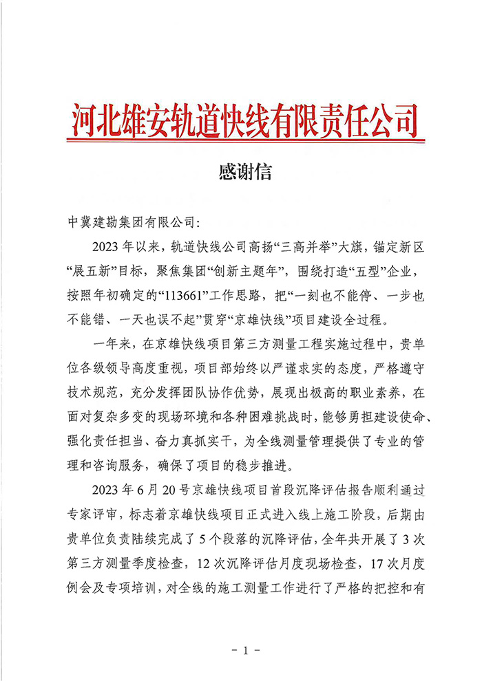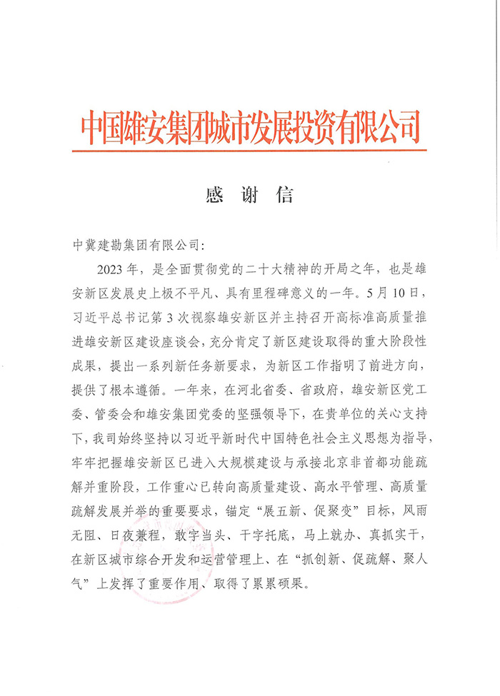 近期,公司陸續(xù)收到中國雄安集團城市發(fā)展投資有限公司、河北雄安軌道快線有限責任公司、中國雄安集團生態(tài)建設(shè)投資有限公司、中鐵五局、中鐵十七局、鄭州地鐵集團、內(nèi)蒙古大唐國際克什克騰旗煤制天然氣電廠、大唐內(nèi)蒙古多倫電廠等業(yè)主單位發(fā)來的感謝信。我公司認真負責、敢打能打硬仗的工作態(tài)度、頑強拼搏的施工風范和一心為業(yè)主服務(wù)的理念,贏得了業(yè)主的高度認可和贊揚,特發(fā)來感謝信深表感謝!