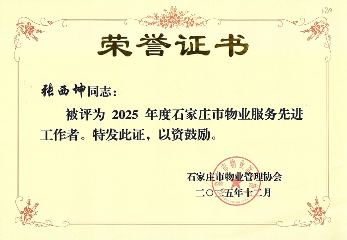 我集團(tuán)所屬物業(yè)服務(wù)公司榮獲“2025年度石家莊市物業(yè)管理先進(jìn)單位”,張西坤同志榮獲“2025年度石家莊市物業(yè)服務(wù)先進(jìn)工作者”榮譽(yù)稱號(hào)。